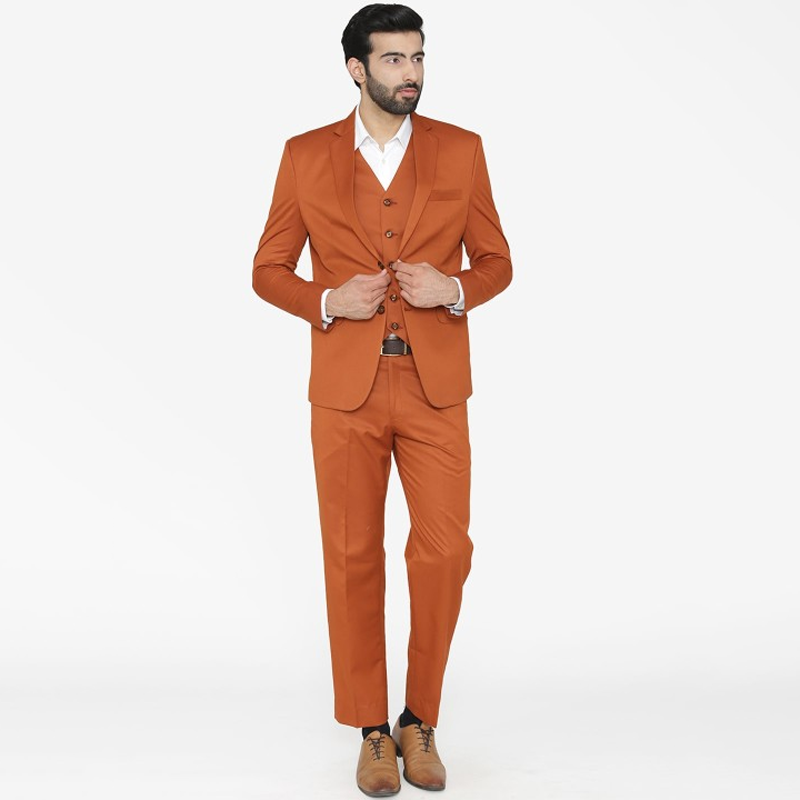 Men Orange Solid Single-Breasted Regular Fit Party Suit